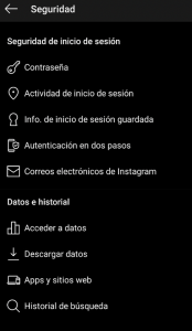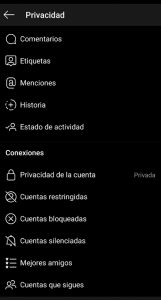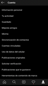 Comienza por el apartado Información Personal (donde puedes agregar número celular de verificación para la cuenta y correo electrónico así como elegir o no especificar tu género). El apartado Tu actividad (es un resumen del tiempo que has dedicado a Instagram por día) y Guardado, (que es nada más y nada menos que los elementos que has decidido guardar, (sin importar el tiempo transcurrido)). Entre otros están, lista de mejores amigos, selección de idiomas, sincronización de tus contactos, cuentas vinculadas, ahorro del uso de datos de tu celular publicaciones originales (si deseas guardarlas automáticamente en tu galería), solicitar verificación, listado de las publicaciones que te han gustado, herramientas de contenido de marca y la opción de cambiar a cuenta profesional o empresarial.